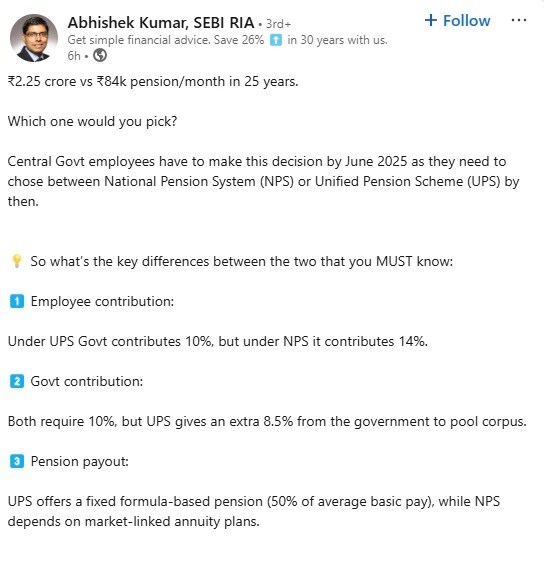 இந்த நிலையில், “மத்திய அரசு ஊழியர்கள் ஜூன் 2025 க்குள் தேசிய ஓய்வூதிய முறை (NPS) அல்லது ஒருங்கிணைந்த ஓய்வூதிய திட்டம் (UPS) இரண்டில் ஒன்றைத் தேர்வு செய்ய வேண்டும்” என்று அபிஷேக் குமார் தனது லிங்டுஇன் பக்கத்தில் தெரிவித்துள்ளார். மேலும், உத்தரவாதமான மாதாந்திர ஓய்வூதியம் அல்லது சந்தை அடிப்படையிலான வருமானத்துடன் கூடிய பெரிய ஓய்வூதிய நிதி ஆகிய இரண்டில் ஒருவர் எதைத் தேர்ந்தெடுப்பார்? என்று கேள்வி எழுப்பிய அவர், “25 வருடங்களில் ரூ. 2.25 கோடி vs ரூ. 84,000 மாத ஓய்வூதியம் இதில் எதை நீங்கள் தேர்ந்தெடுப்பீர்கள்?” என்றும் அவர் கேள்வி எழுப்பியுள்ளார்.