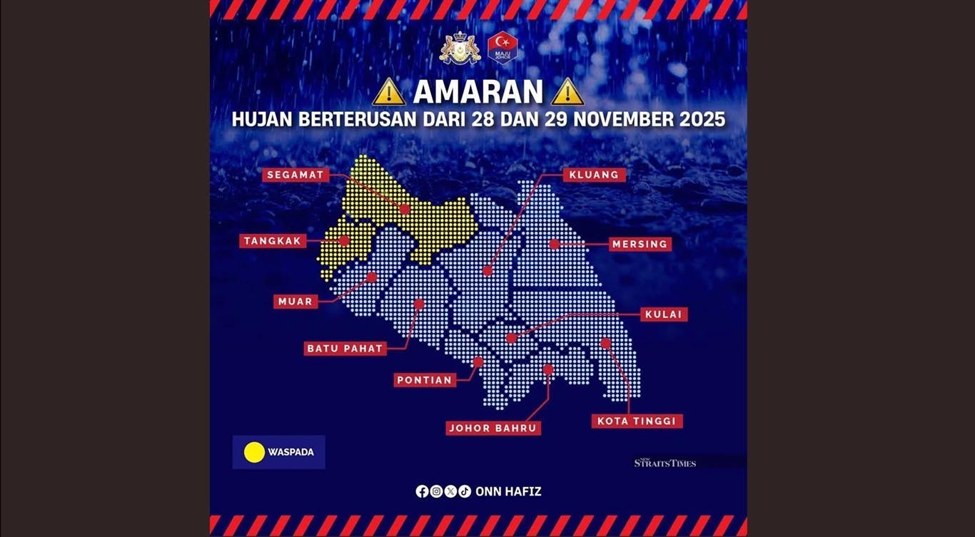 நவம்பர் 28 முதல் 29 வரை சிகாமாட் மற்றும் தங்காக் ஆகிய மாவட்டங்களில் தொடர்ச்சியான மழை பெய்யும் என மலேசிய வானிலை ஆய்வு மையம் (MetMalaysia) அறிவித்துள்ளது.