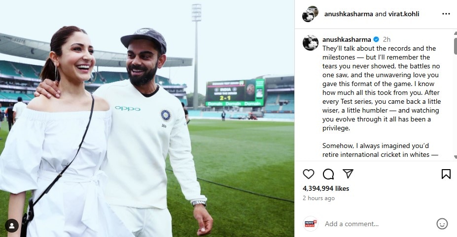 இந்நிலையில் விராட் கோலியின் ஓய்வு குறித்து அவரது மனைவியும் நடிகையுமான அனுஷ்கா சர்மா தனது கருத்தை தெரிவித்துள்ளார். கிரிக்கெட் மைதானத்தில் இருவரும் ஒன்றாக இருக்கும் படத்தைப் பகிர்ந்து கொண்ட அனுஷ்கா, “மக்கள் சாதனைகள் மற்றும் மைல்கற்களைப் பற்றிப் பேசுவார்கள். ஆனால் நீங்கள் ஒருபோதும் காட்டாத கண்ணீர், யாரும் பார்க்காத சண்டைகள் மற்றும் விளையாட்டு மீதான உங்கள் தீராத அன்பு ஆகியவற்றை நான் நினைவில் கொள்வேன்” என்றுள்ளார்.