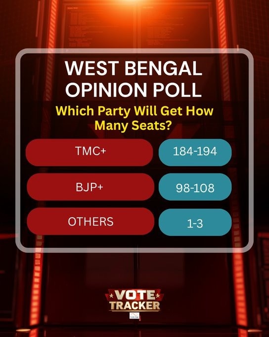 தற்போதைய நிலவரப்படி மொத்தம் உள்ள 294 தொகுதிகளில் திரிணாமூல் காங்கிரஸ் கூட்டணி 184 முதல் 194 இடங்களிலும் பாஜக கூட்டணி 98 முதல் 108 இடங்கள் வரையிலும் வெற்றி பெற வாய்ப்புள்ளது.